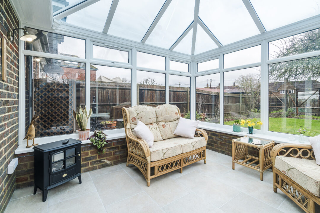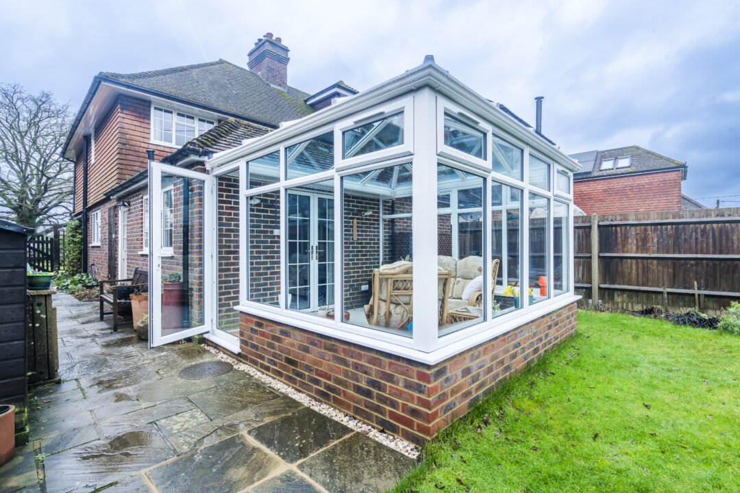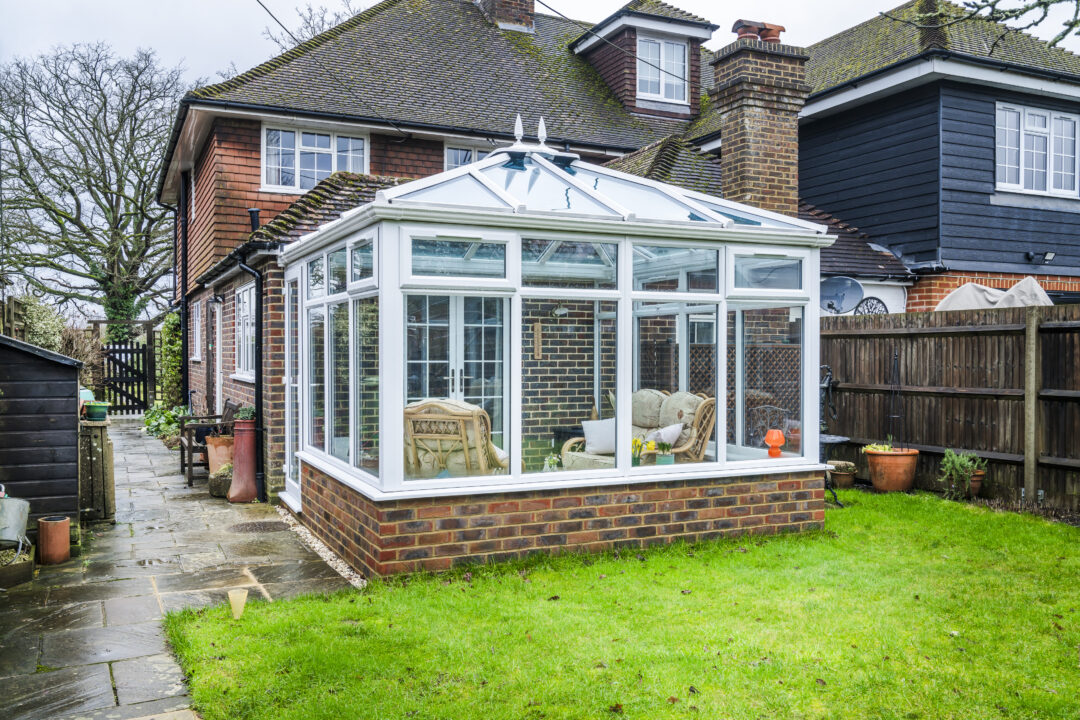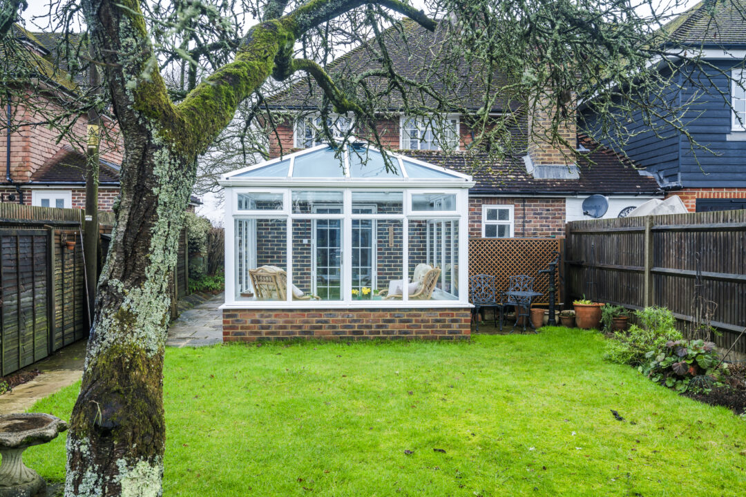 We recommended a double Edwardian conservatory to connect neatly onto the existing low-pitch extension while increasing ceiling height. This created a brighter and more open feel without dominating the rear elevation. A dwarf wall was introduced to ground the structure visually and remove any greenhouse appearance. Brickwork was carefully matched to the house and finished internally and externally to retain a rustic character. Clean glazing with large panes was specified to remove visual obstructions and frame the garden properly. The dwarf walls also provided ideal locations for sockets, heaters, and planting.