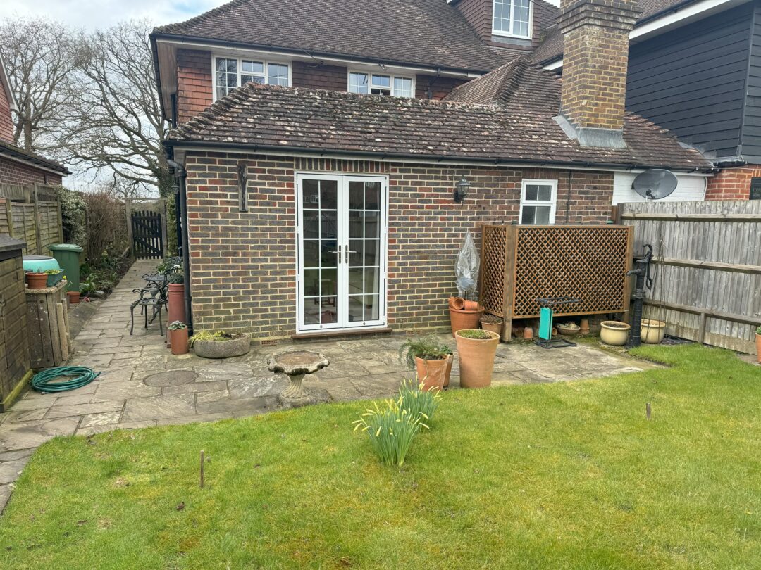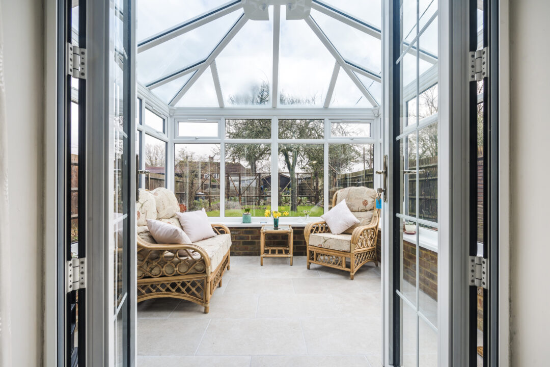 This customer owns a characterful home with a beautiful garden on the Surrey–Sussex border. The existing rear lounge had limited connection to the outdoors, with narrow French doors and leaded glass that broke up the view. They wanted a space where they could enjoy the garden for most of the year without overpowering the house or losing its charm.