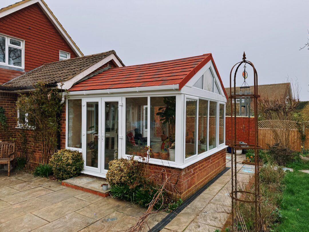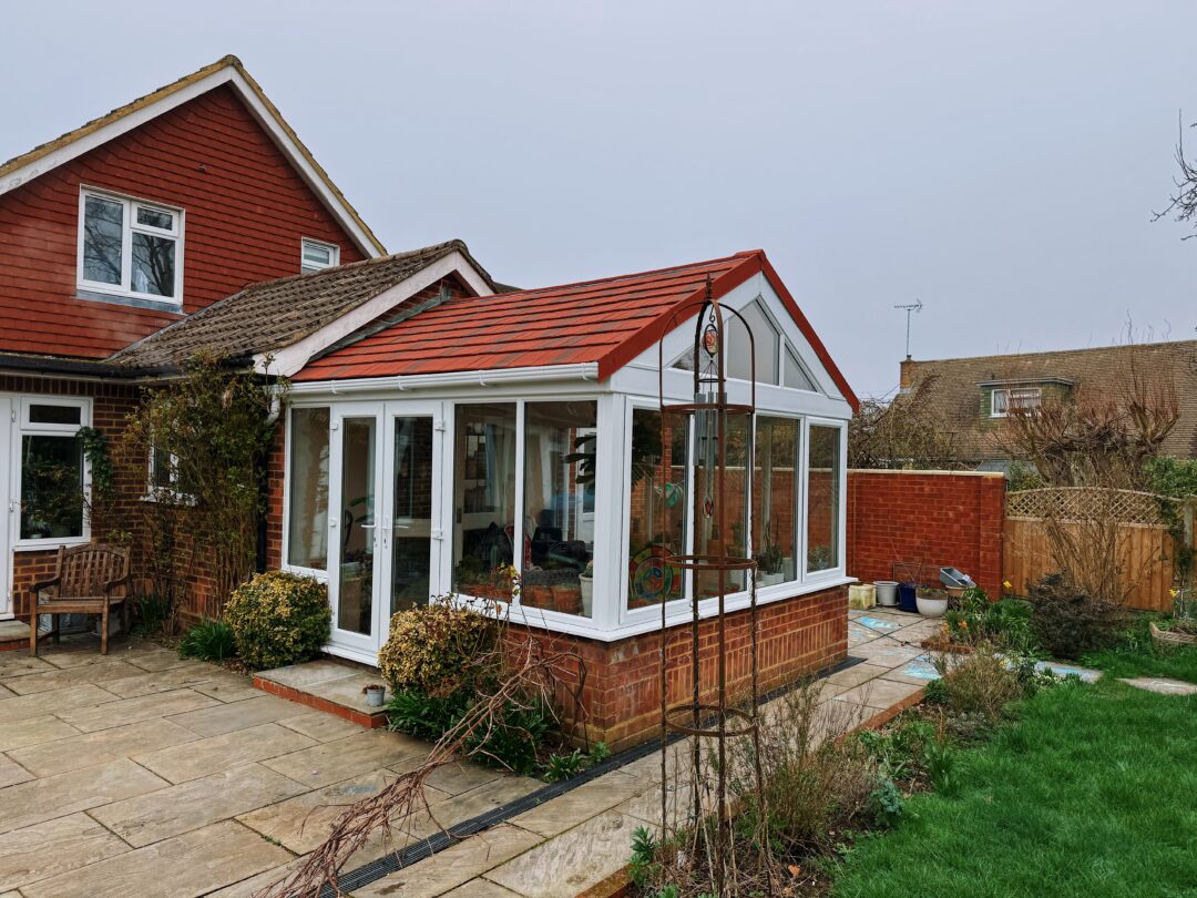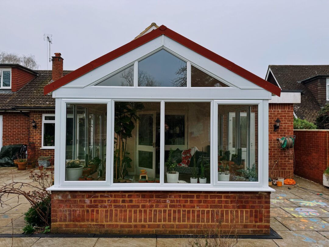 We recommended a full rebuild while retaining the existing base and walls, which were structurally sound. This helped control costs while providing a strong foundation for the new build. The gable design was kept to maintain the familiar shape and ceiling height, which also allowed more light to enter through the front elevation. A super insulated tiled roof was installed to ensure year-round comfort. Large panes of glass without horizontal bars were specified to provide clear, uninterrupted views of the garden. The red tiled roof finish was selected to match the main house and tie the structure together visually.
