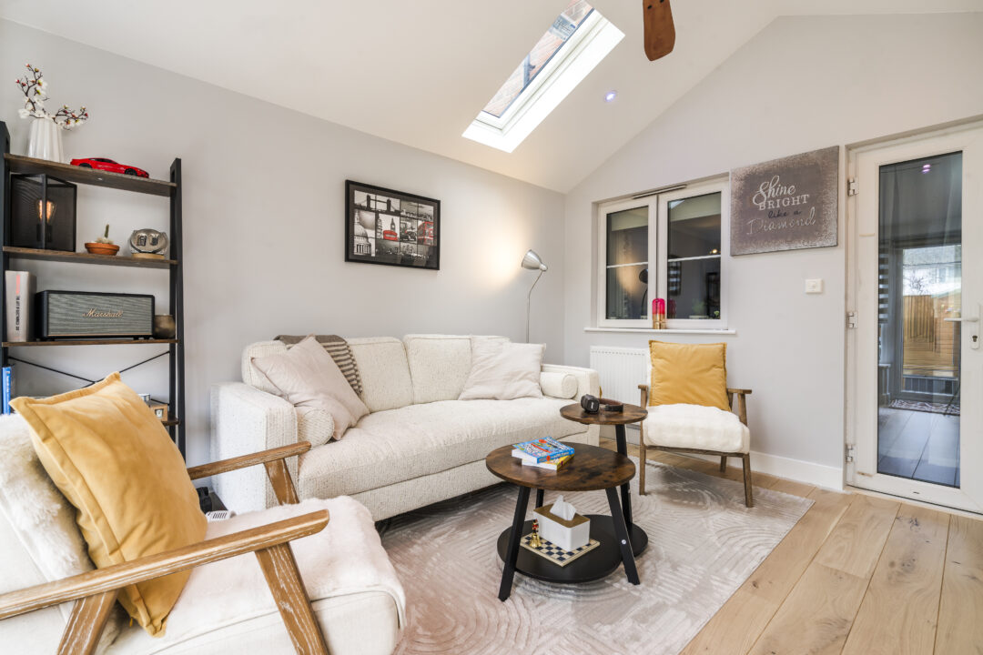 The completed extension delivers a warm, modern lounge that works comfortably all year. Despite the long projection and solid construction, natural light has been carefully retained in both the new space and the existing rear rooms. The layout works perfectly for family living, and the extension feels fully integrated with the house rather than added on. Finished with high-quality internal décor by the customer, the room has become a central feature of the home. The success of the project has led the customer to proceed with a loft conversion through our team.